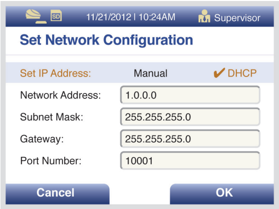 Firmware v2.0 and higher - Navigate to the Supervisor Menu -> Settings -> Network Settings -> Set Network Configuration