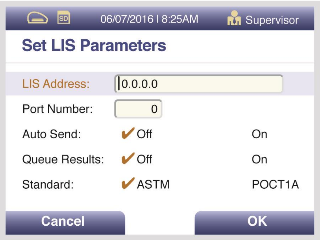 Within all Sofia instruments with firmware version higher than v2.1, the LIS Parameters are default set to ASTM and needs to be changed to the POCT1A setting. This POCT1a interface is configured by setting the LIS Parameters.